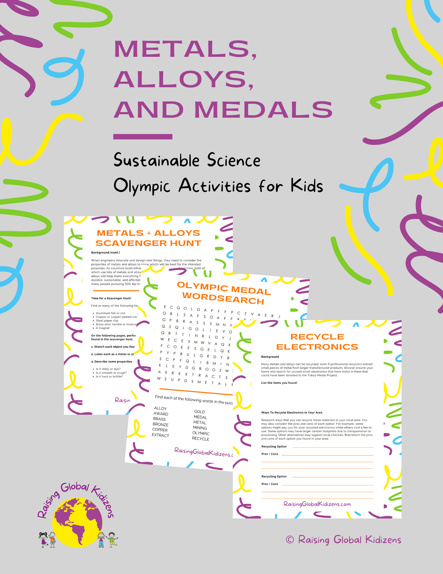 This workbook contains the following: Framework to Create Your Own Upcycled Olympic Medal, Olympic Medal Word Search, Medal vs Metal Vocabulary Building Activity, Recycle Your Electronics, and a Metals and Alloys Scavenger Hunt.